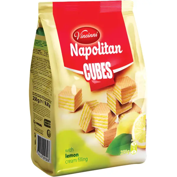 Vincinni Napolitan Lemon Cubes 250g combine crisp wafer layers with smooth, tangy lemon cream for a refreshing and delicious treat. Additionally, these bite-sized cubes are perfect for snacking or sharing with friends.
