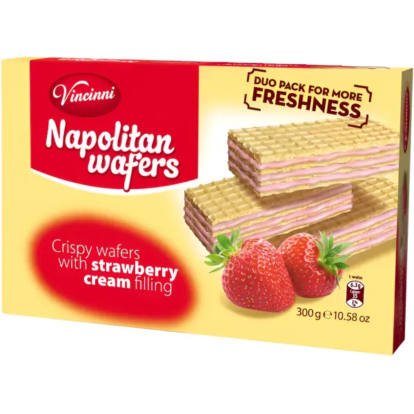 • Crisp & Light – Thin, crunchy wafers for the perfect texture. Vincinni Napolitan Strawberry Wafers.