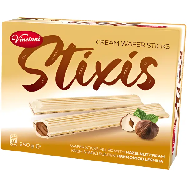 Vincinni Stixis Hazelnut Cream Wafer 250g combines crisp, light wafer layers with smooth hazelnut cream for a perfectly balanced treat. Additionally, this delightful snack delivers the ideal harmony of crunch and nutty sweetness, making it a favorite for wafer and hazelnut lovers alike. Available at Global Imports & Exports – Wholesale European Food Distributors, Florida’s largest European food distributor. Finally, Vincinni Products Distributor in Florida & USA. Largest Distributor of European Foods.